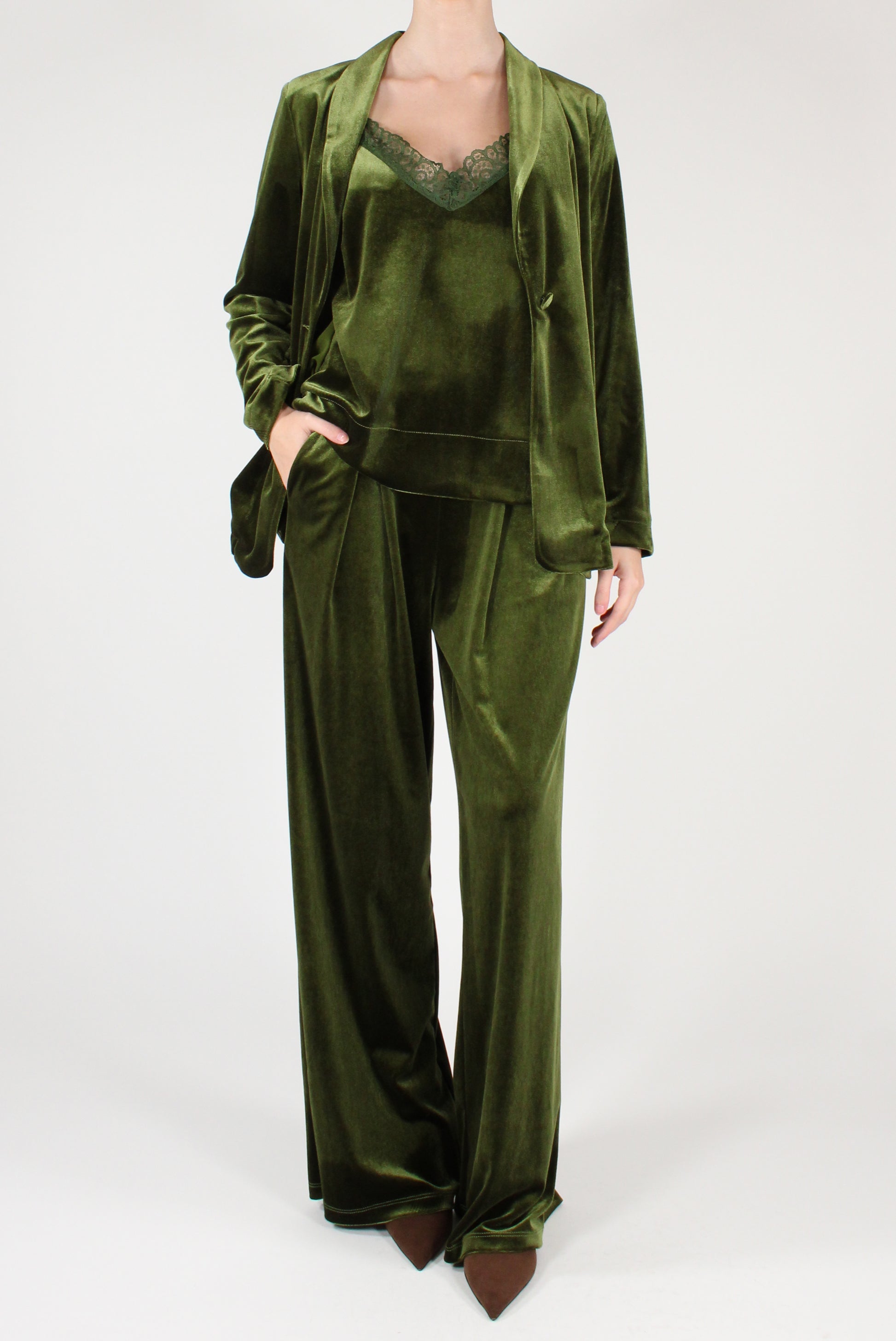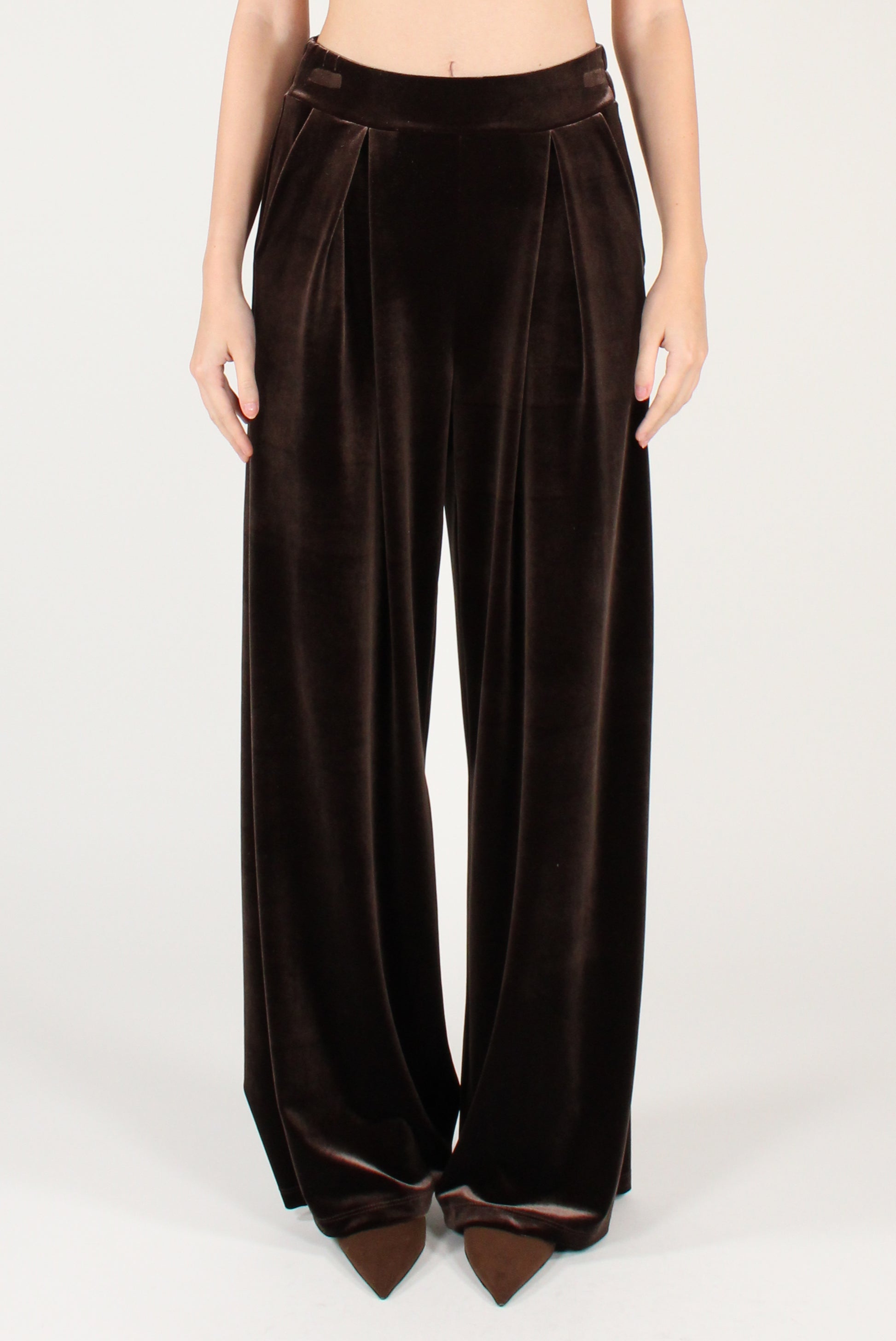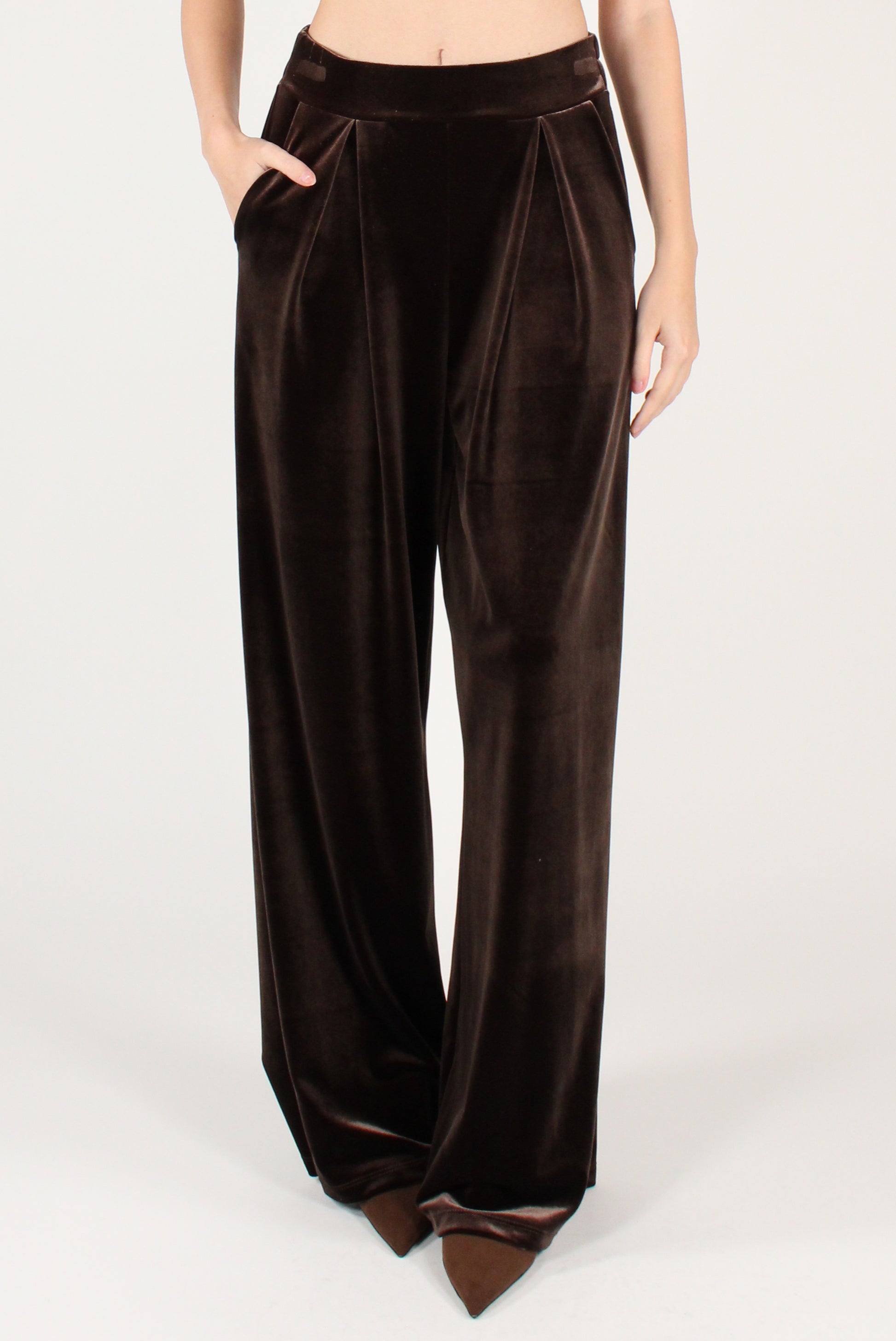 Pantaloni con pinces in velluto liscio elasticizzato. A palazzo, con tasche laterali ed elastico in vita solo sul retro. Top e giacca coordinati disponibili.