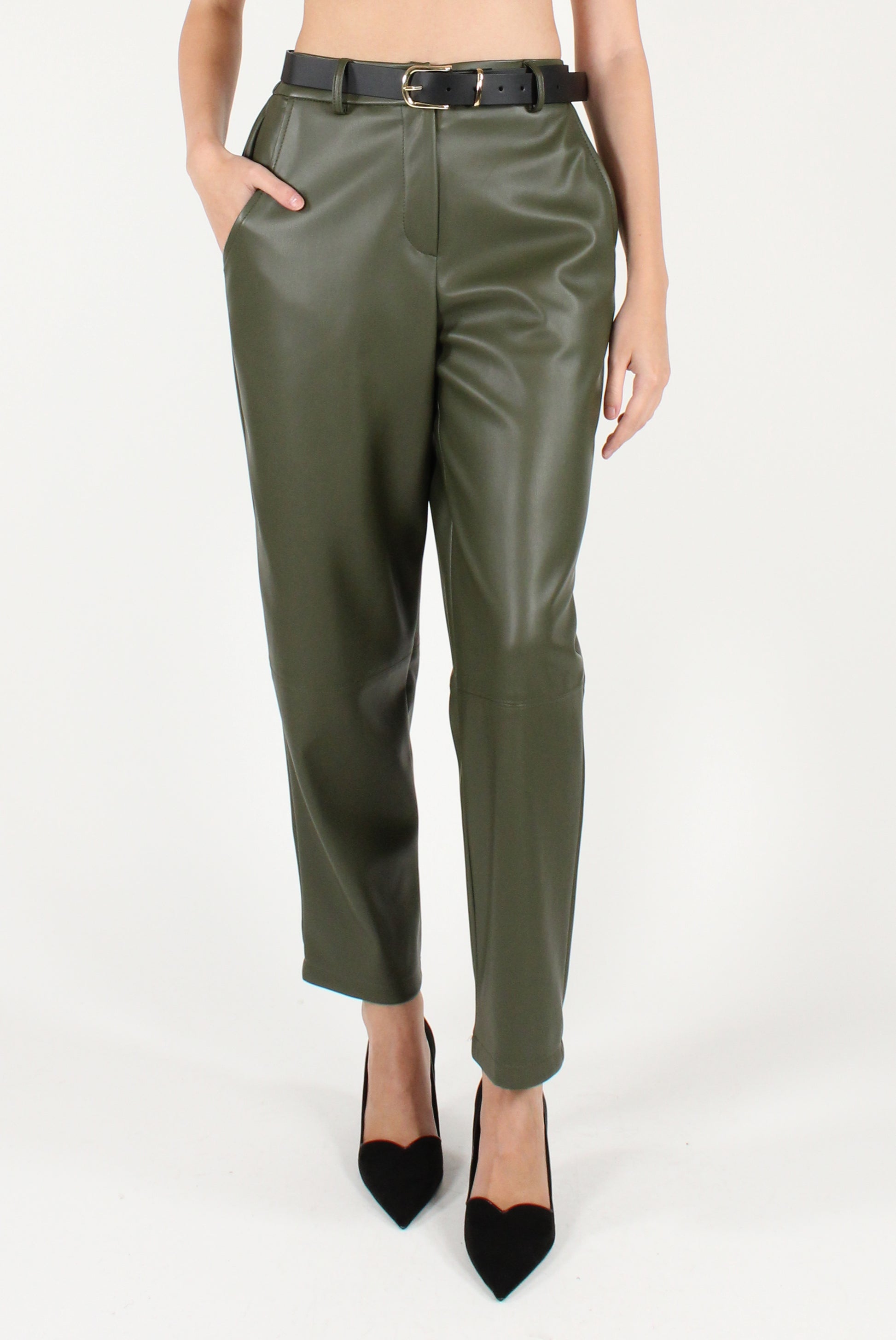 Pantaloni in ecopelle con cintura inclusa removibile. Con tasche laterali, chiusura a zip e bottone con passanti ed elastico in vita solo sul retro. Dettaglio cuciture a vista.