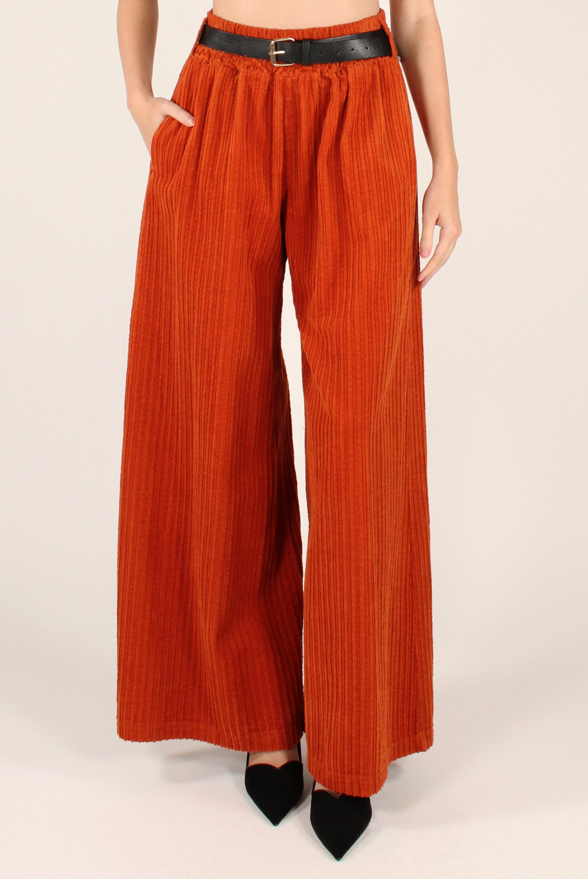 Pantaloni in velluto a coste larghe. Modello a gamba larga, con tasche laterali, elastico in vita con passanti e cintura inclusa removibile.