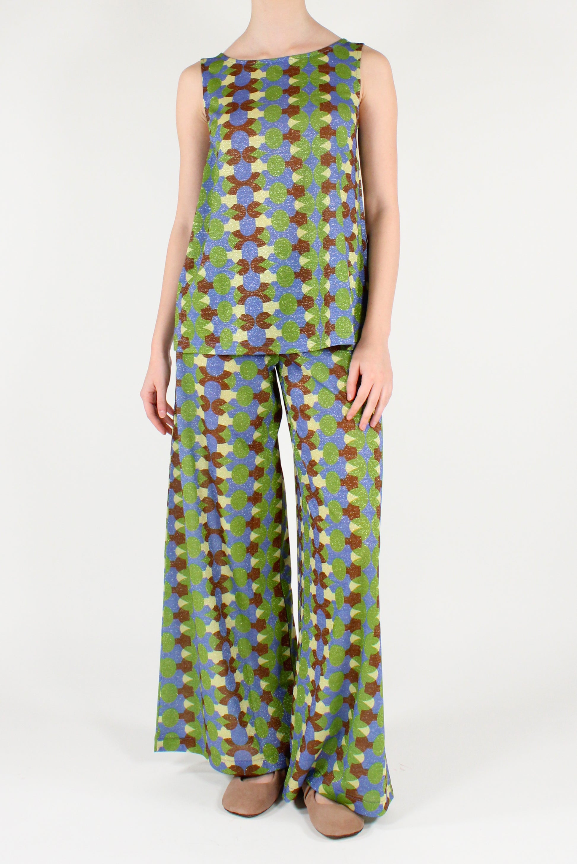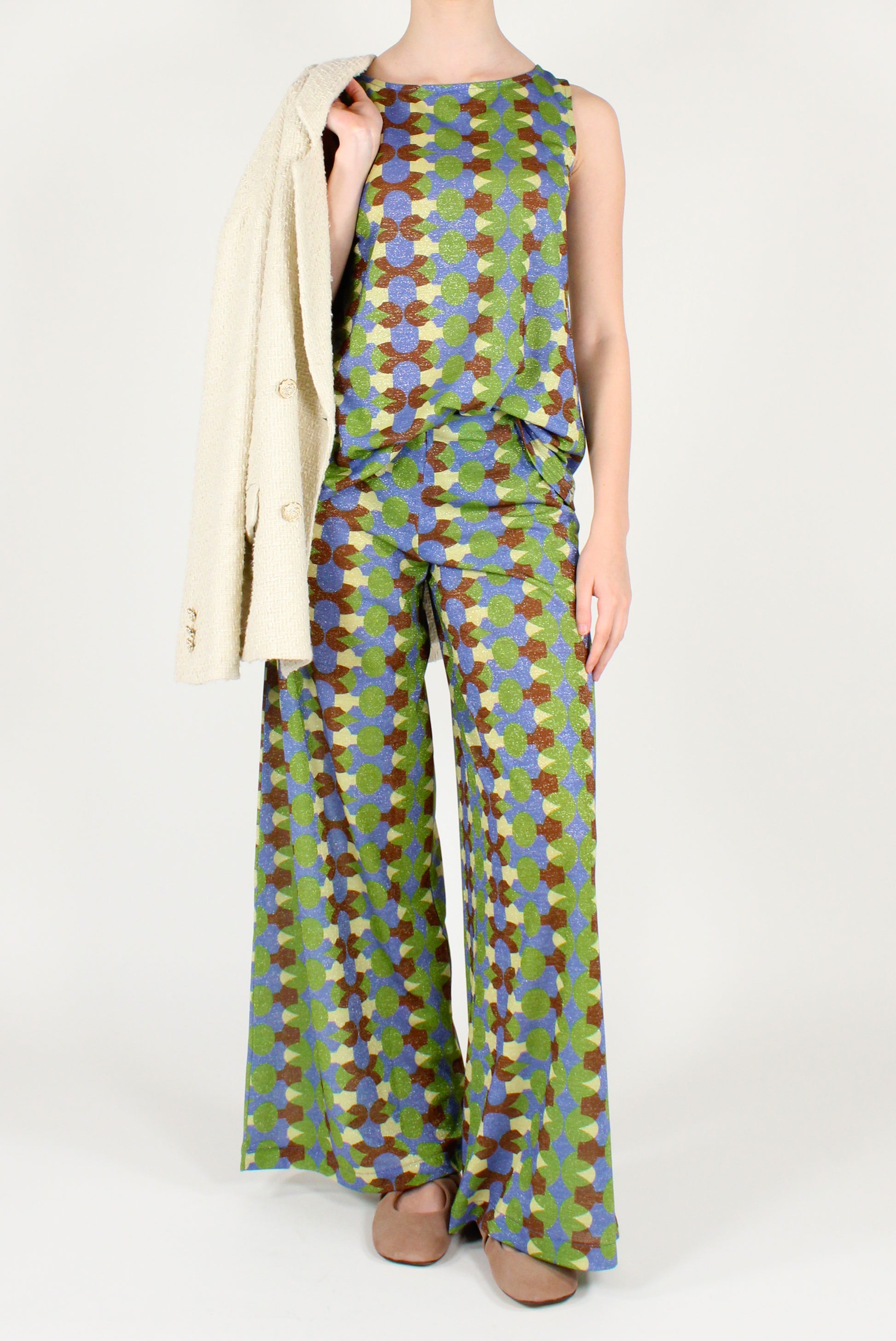 Pantaloni a palazzo fantasia con lurex. Modello fluido con elastico in vita, eleganti e luminosi. Top coordinato disponibile.