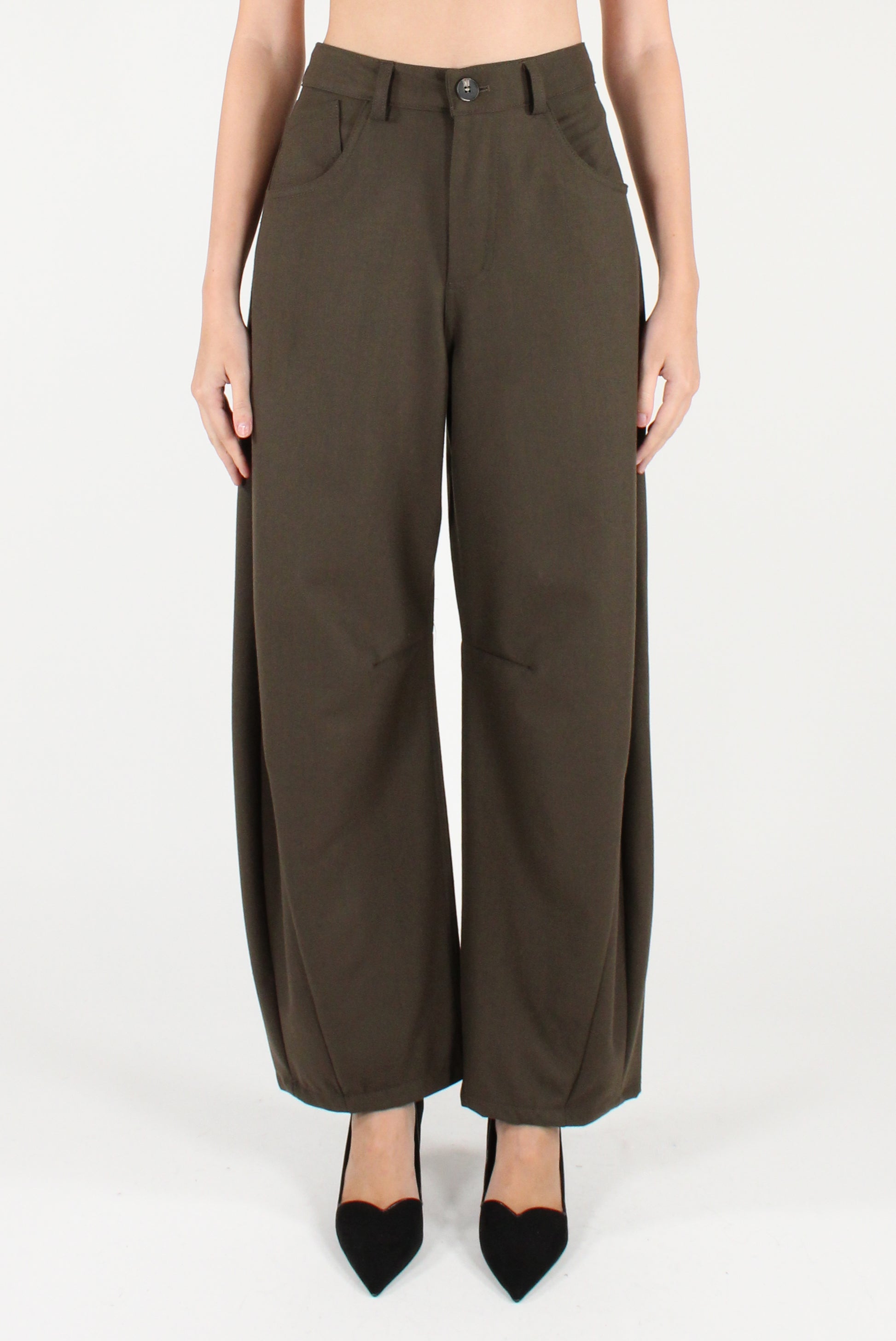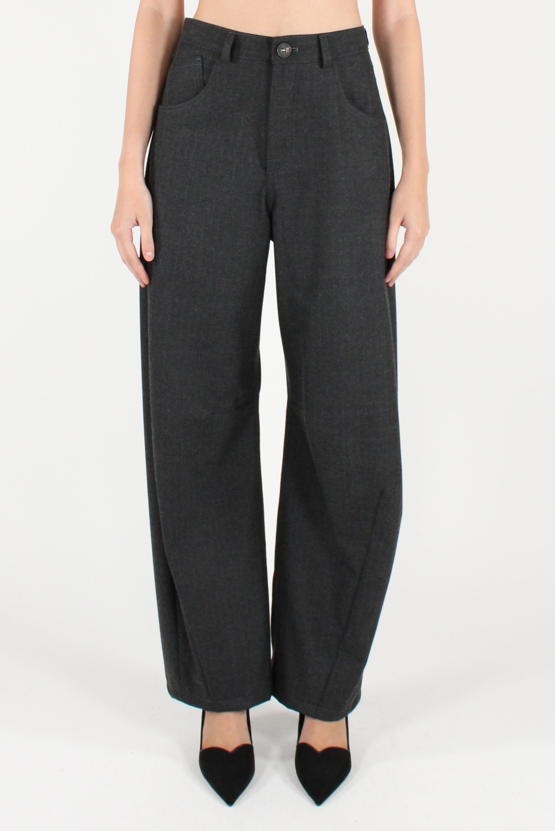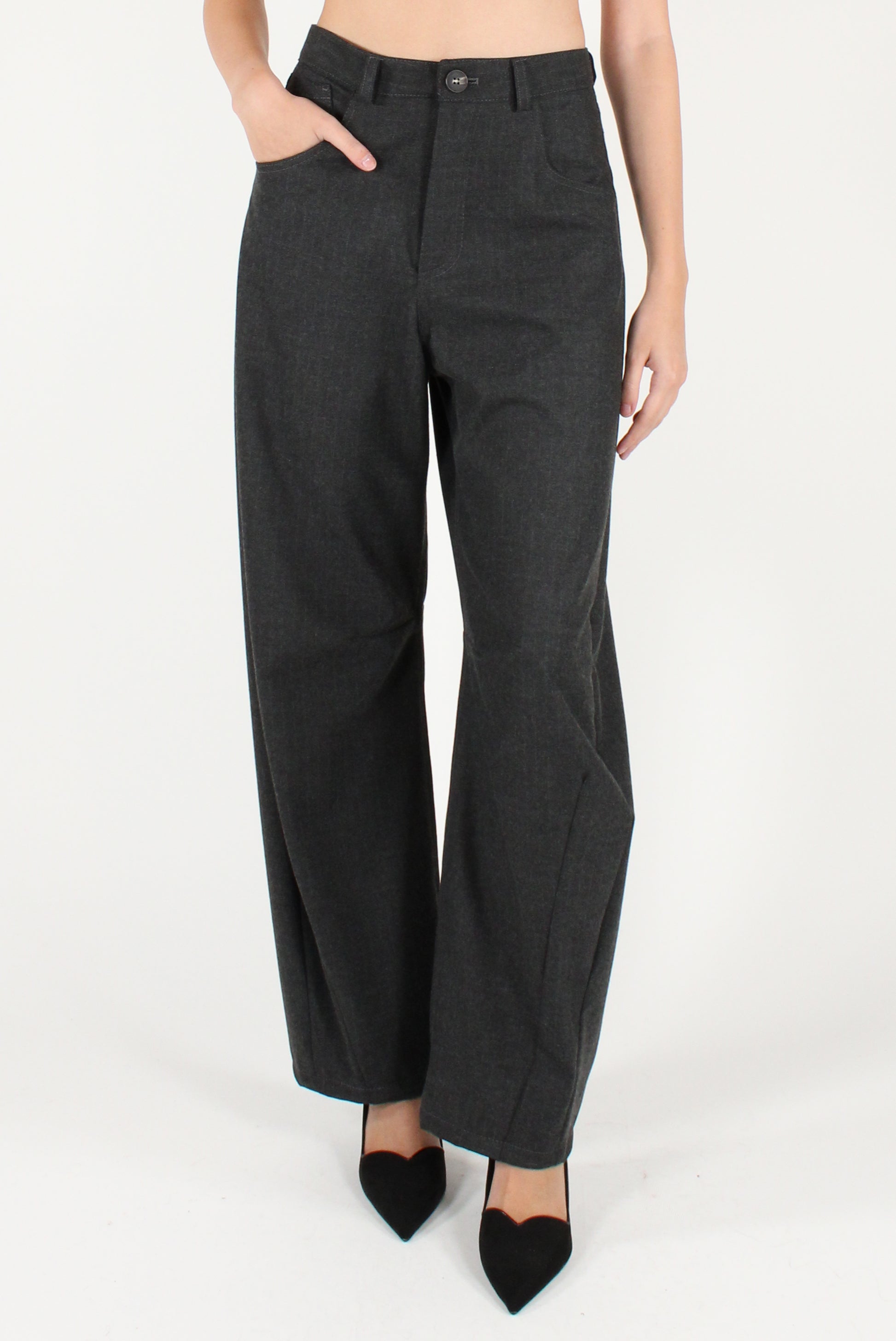 Pantaloni semi balloon gessati tono su tono. Cinque tasche con chiusura a zip e bottone, con passanti. Dettaglio cuciture a vista.