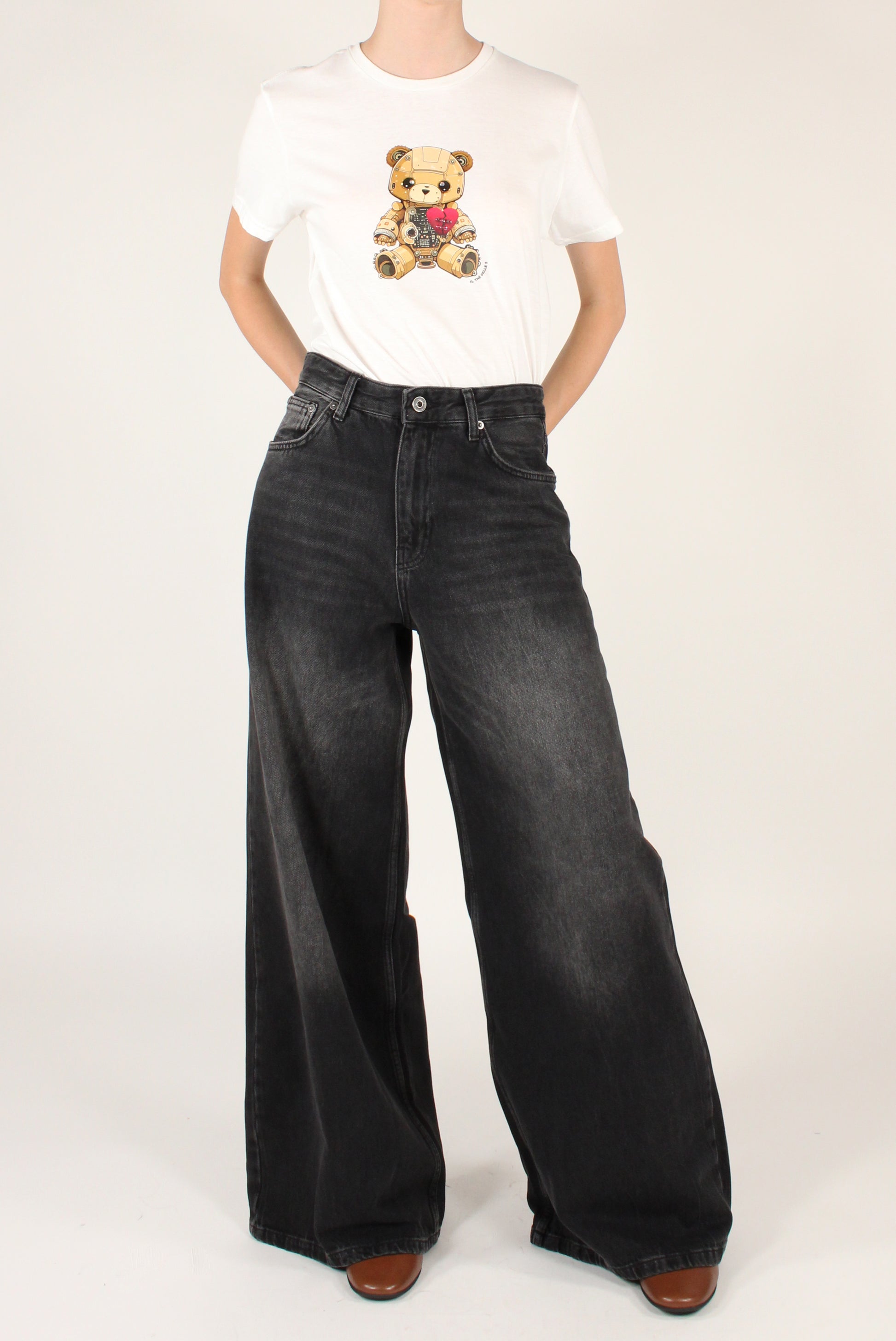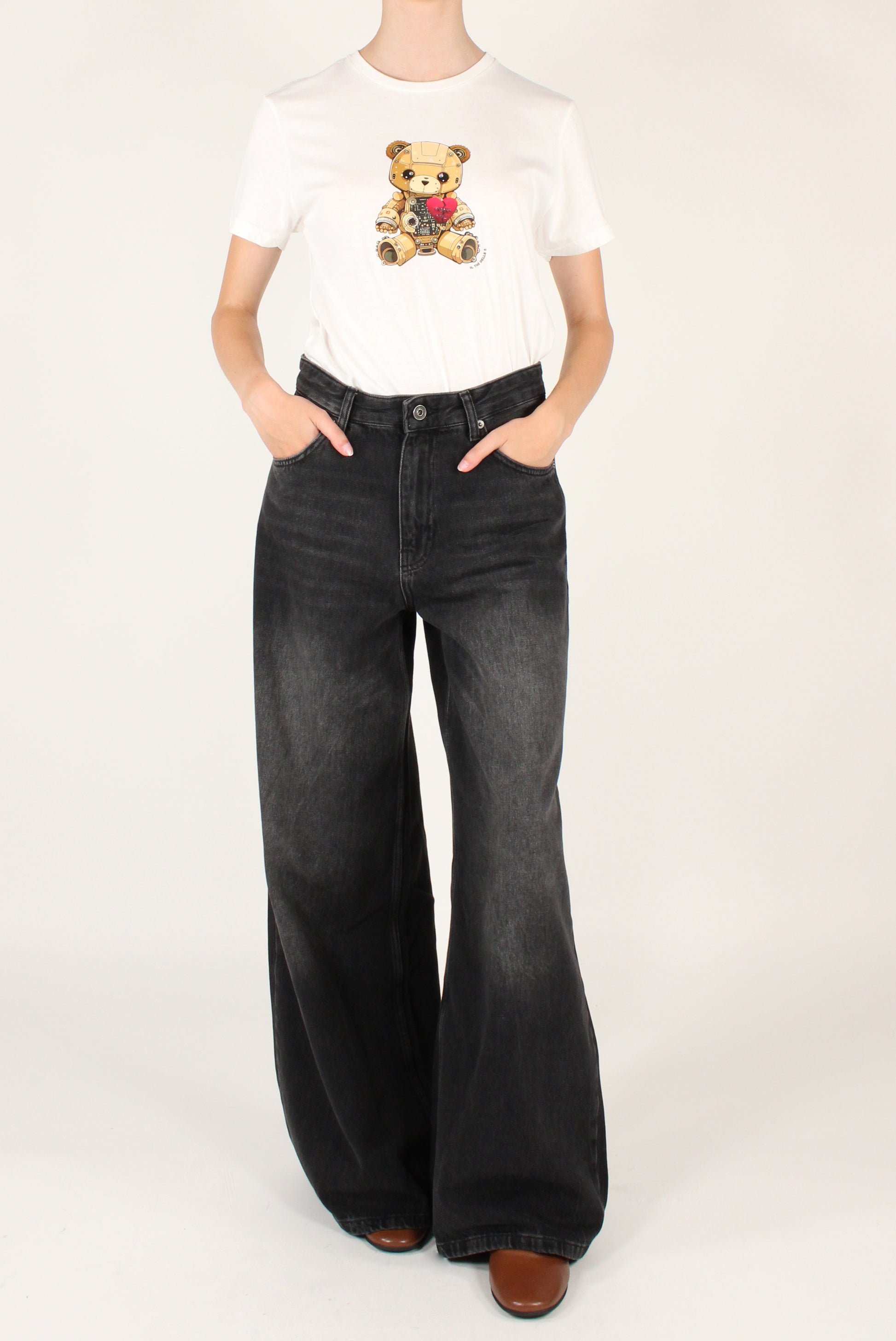 T-shirt stampa orsetto robot. Girocollo, 100% cotone, dettaglio strass applicati.