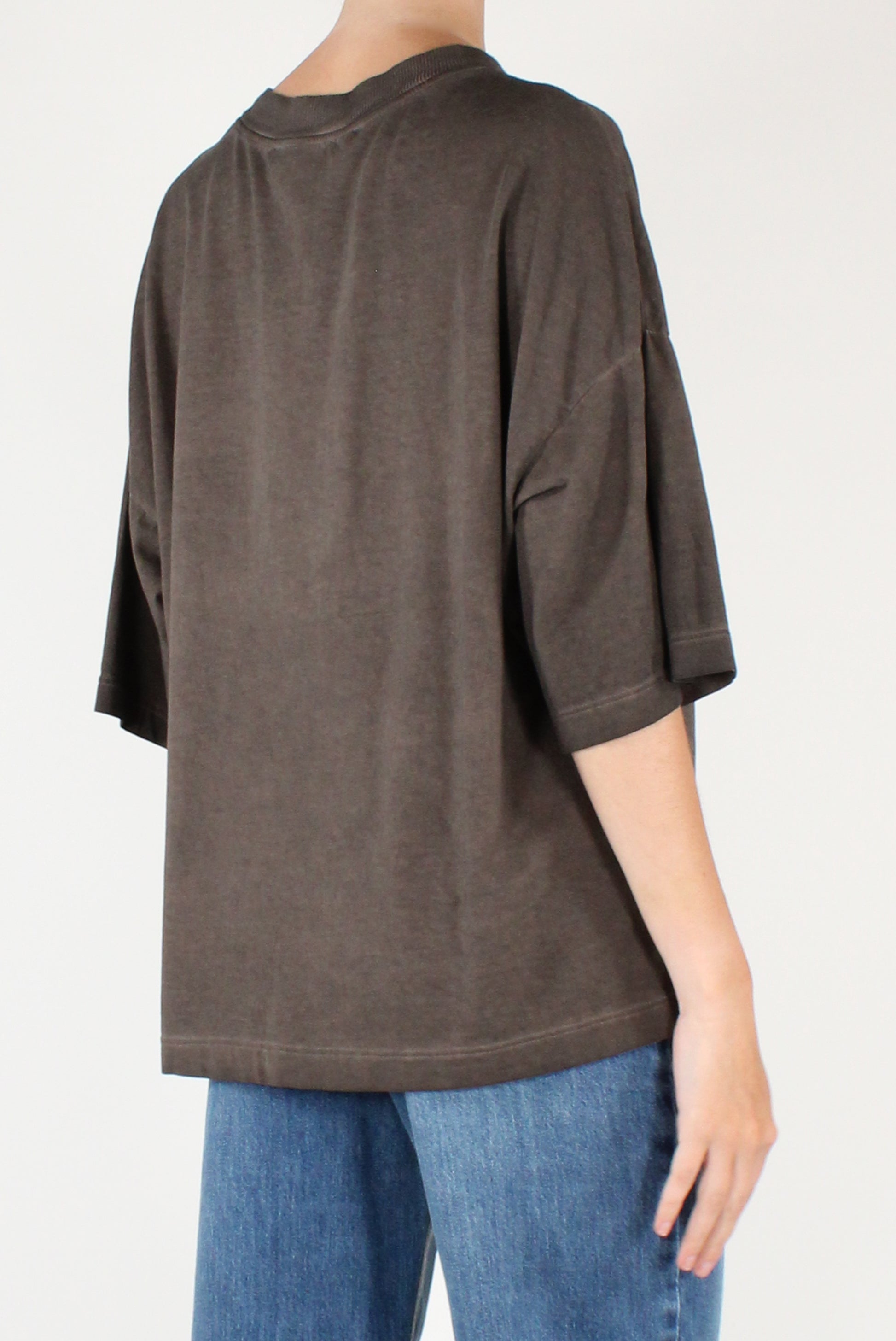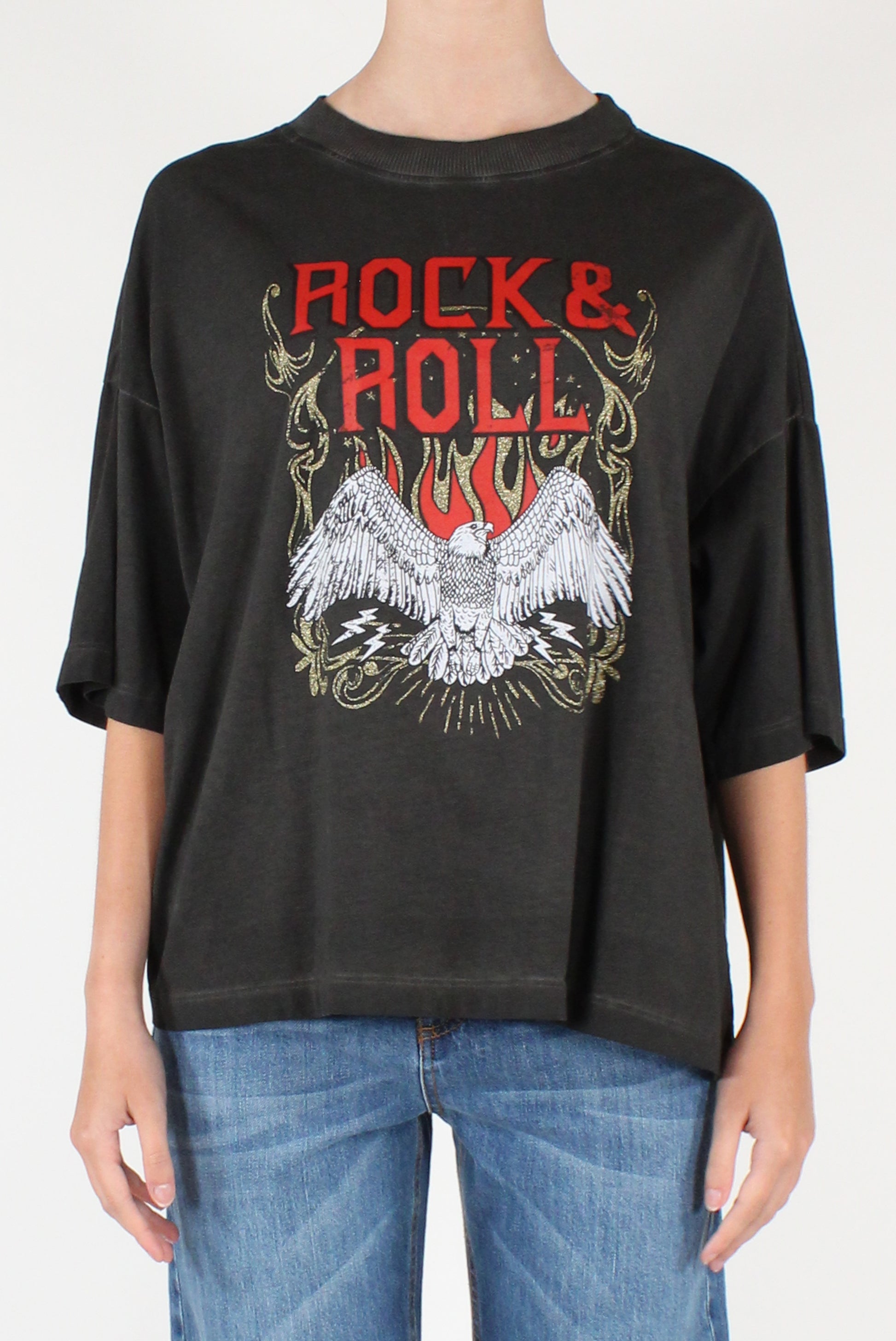 T-shirt stampa Rock&Roll e aquila sul davanti. Girocollo, vestibilità over, 100% cotone elasticizzato effetto slavato.