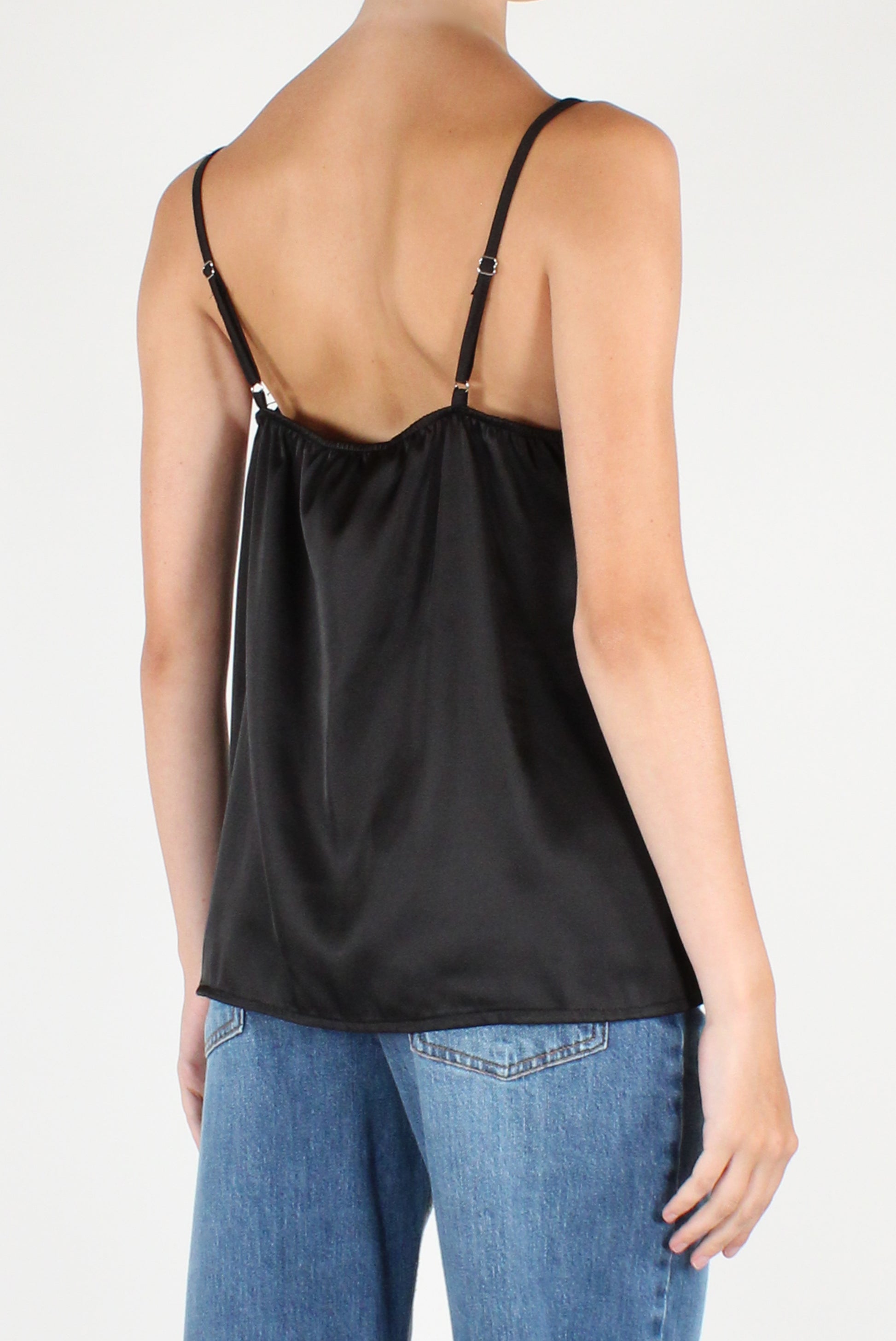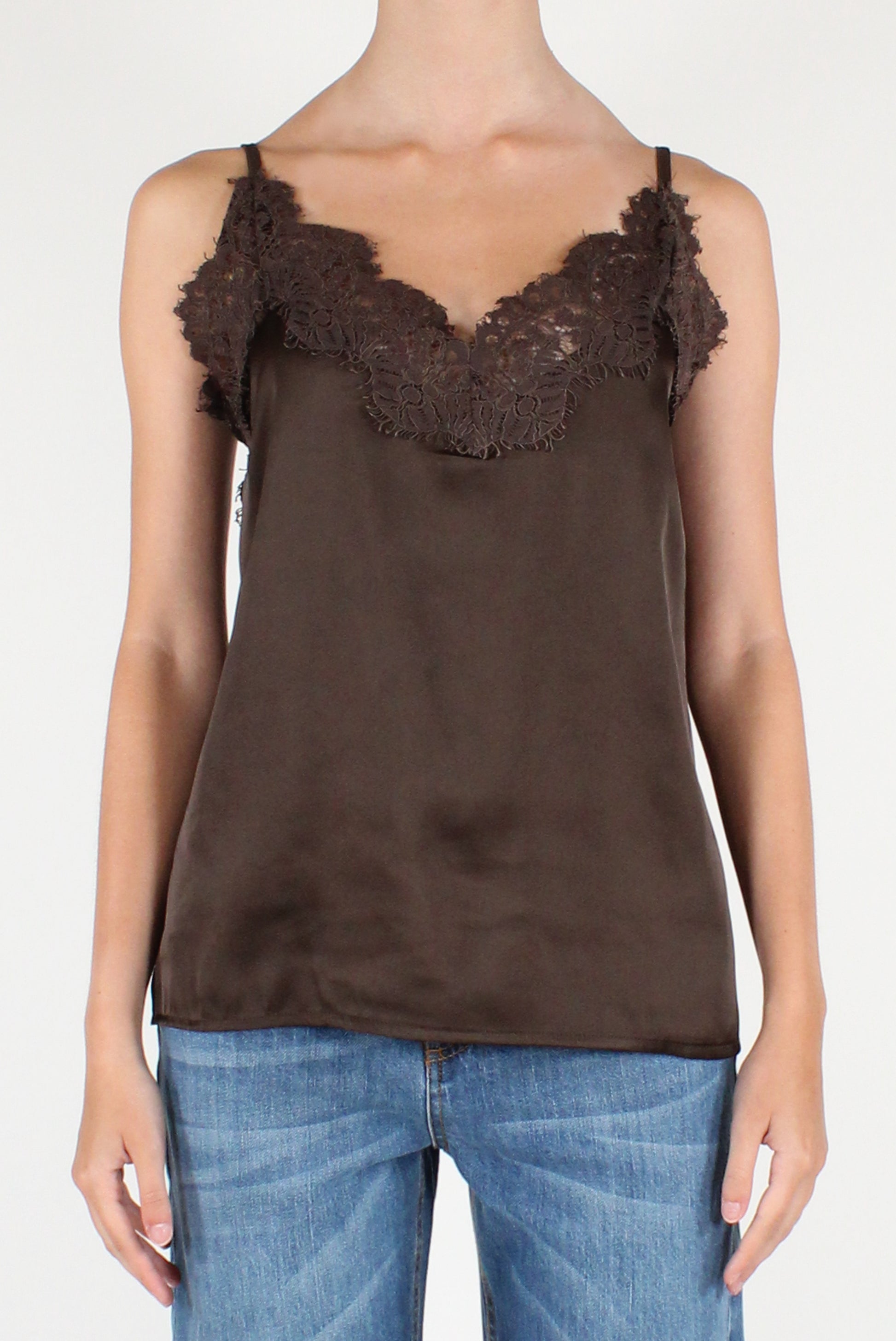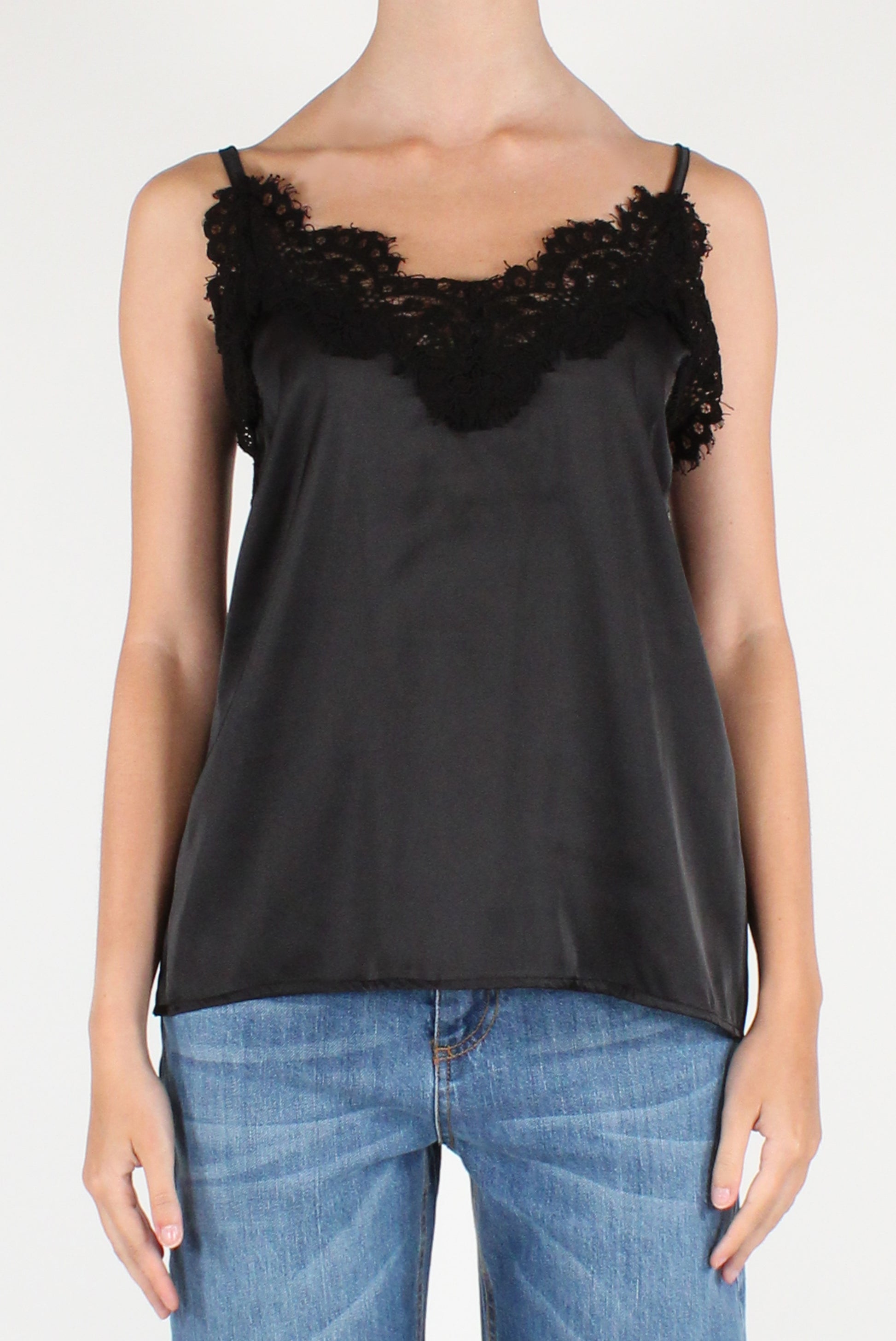 Top smanicato in raso con pizzo sulla scollatura. Scollo a V, con spalline sottili regolabili e dettaglio elastico sul retro.