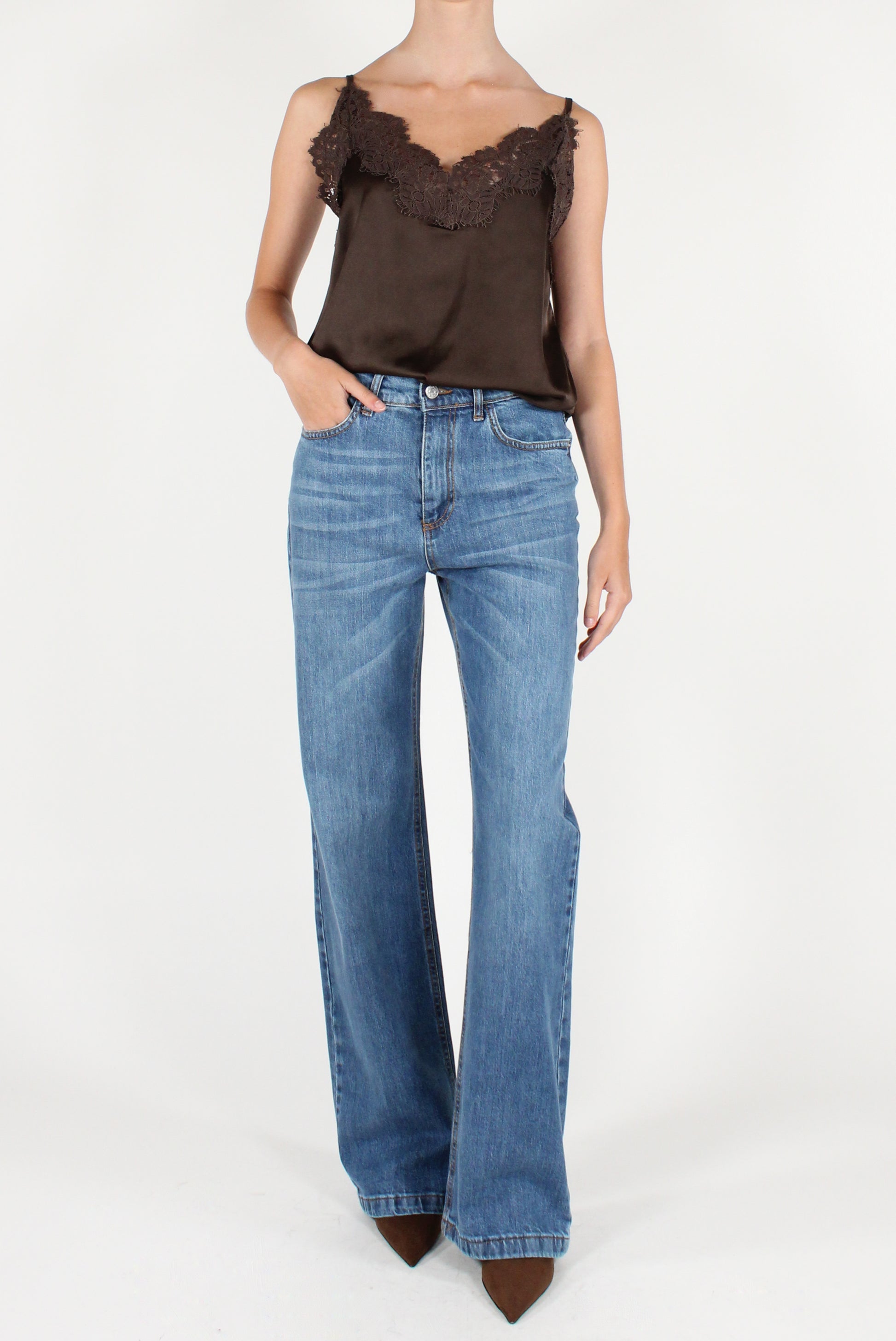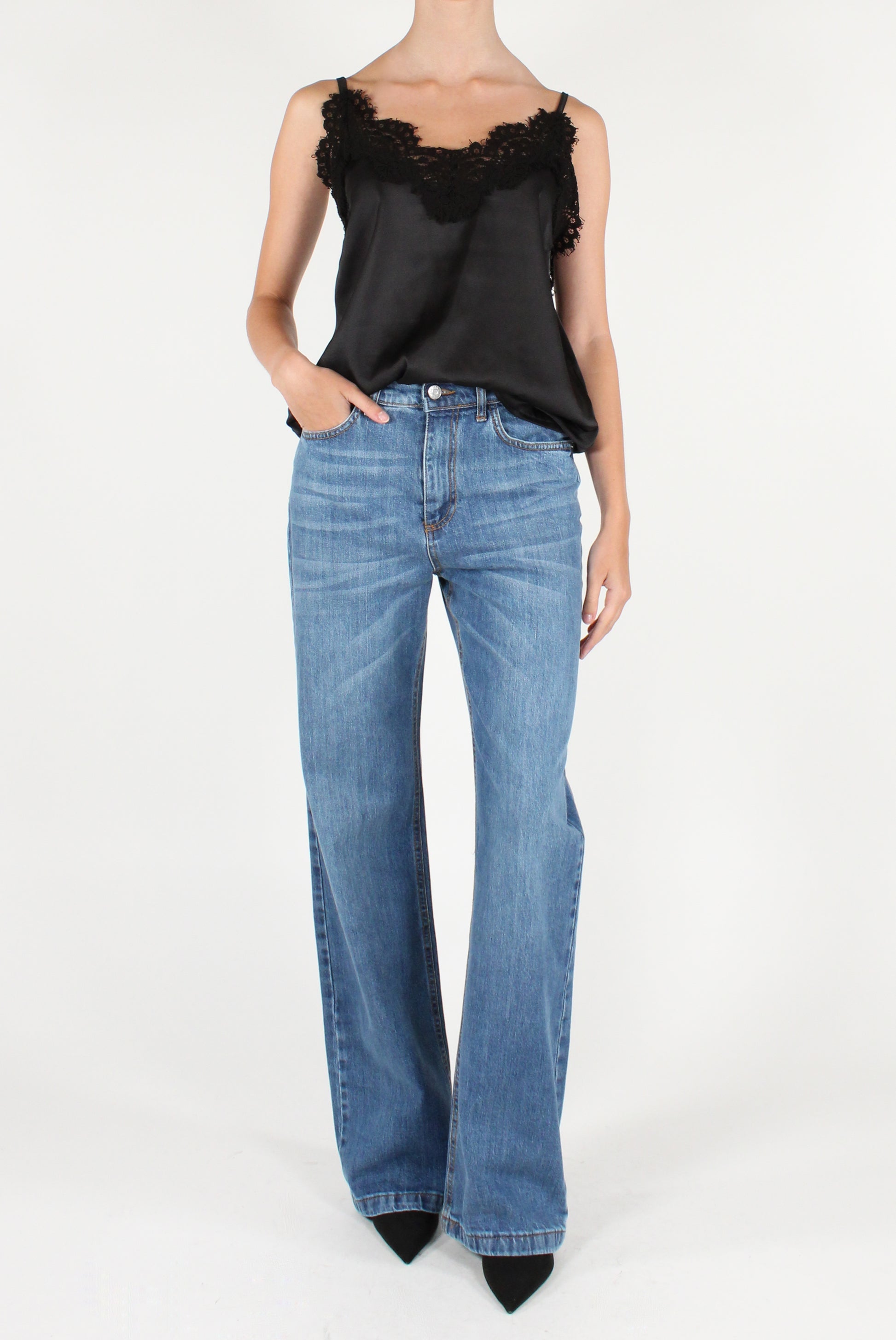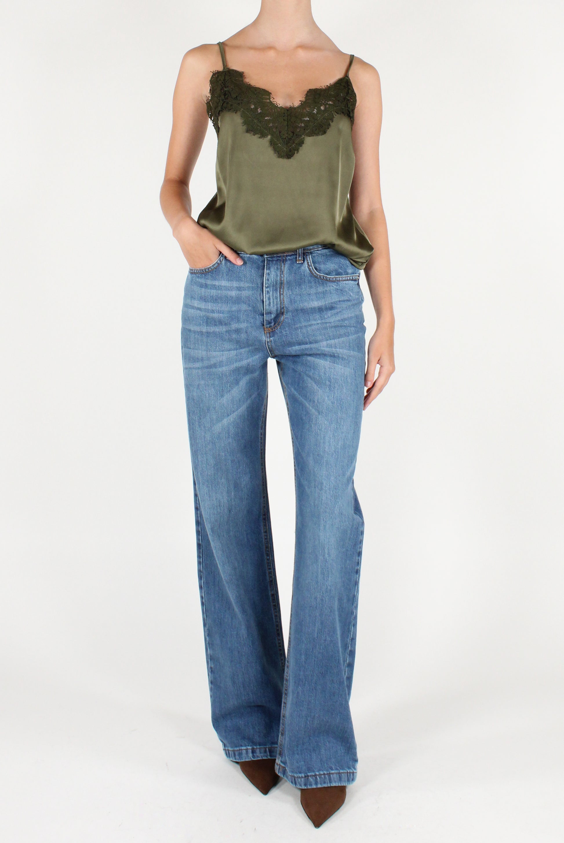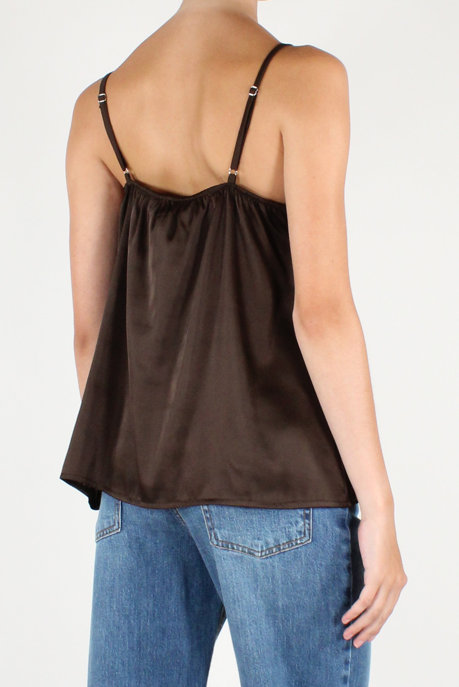 Top smanicato in raso con pizzo sulla scollatura. Scollo a V, con spalline sottili regolabili e dettaglio elastico sul retro.