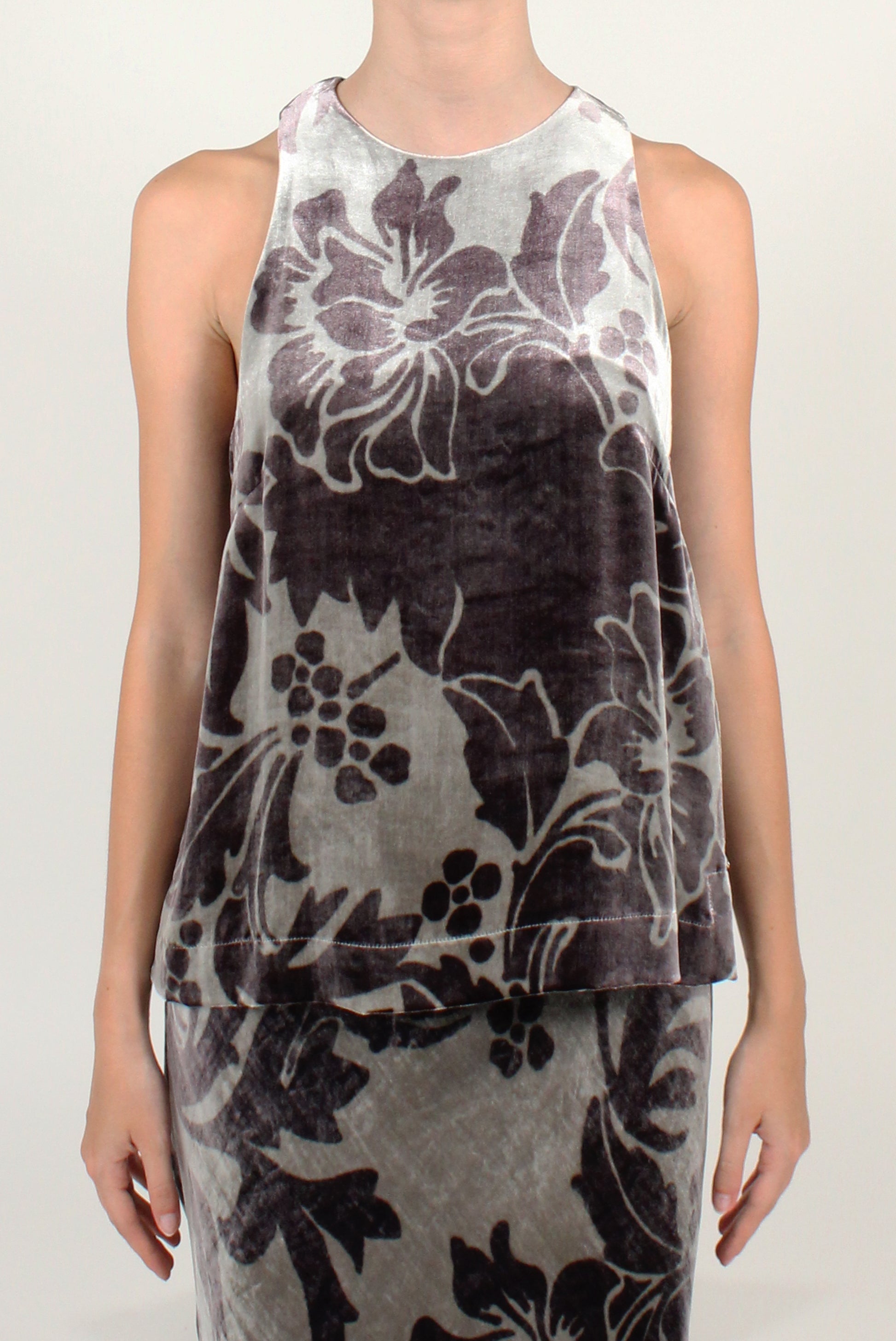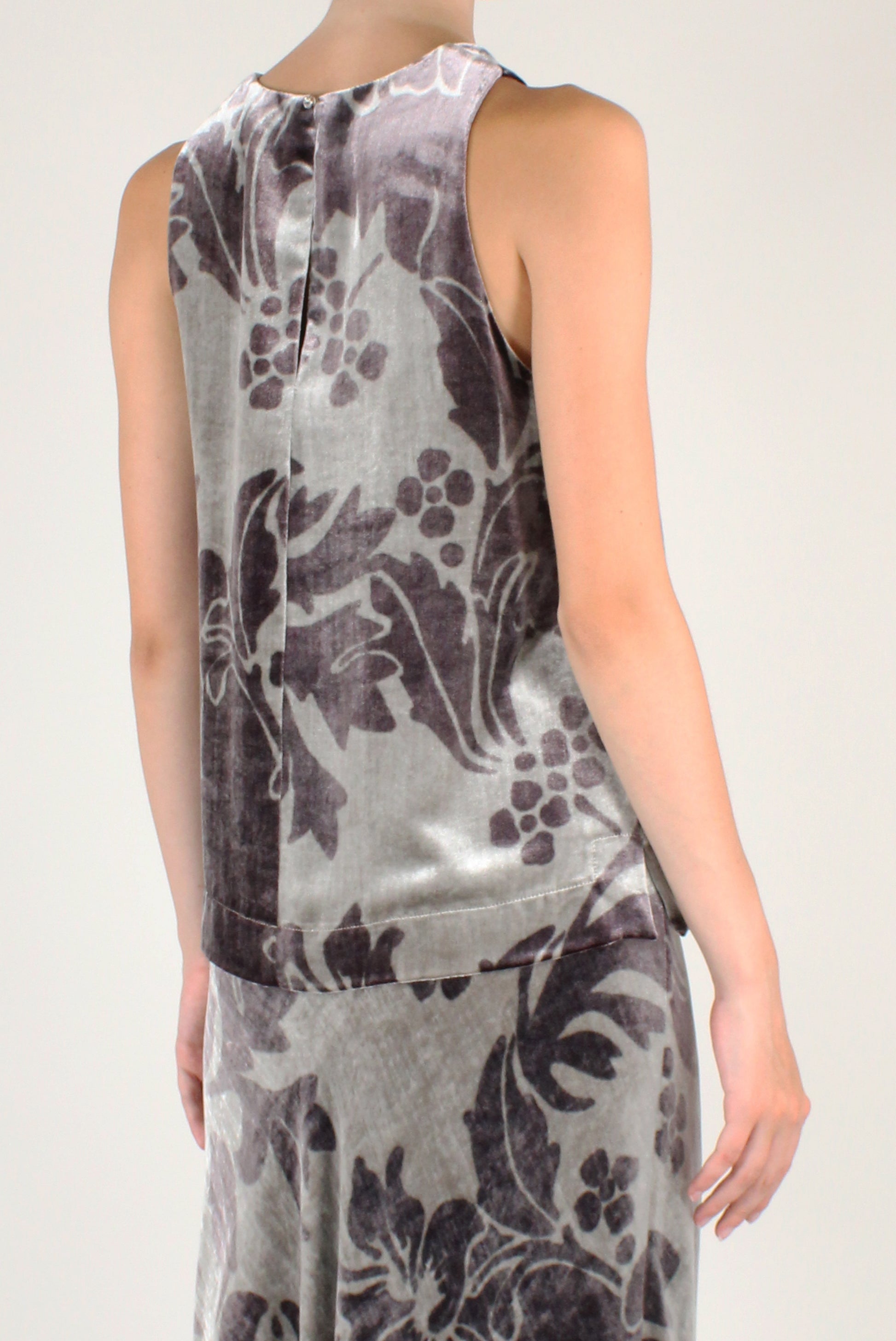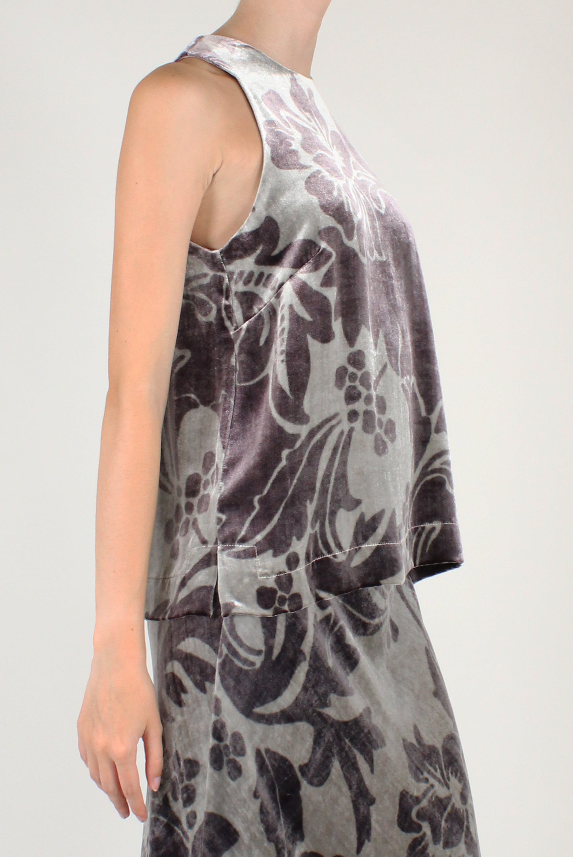 Top smanicato in velluto stampato a decorazione floreale in viscosa misto seta. Girocollo, taglio svasato con spacchetti laterali e dettaglio bottoncino gioiello dietro al collo. Gonna lunga coordinata disponibile.